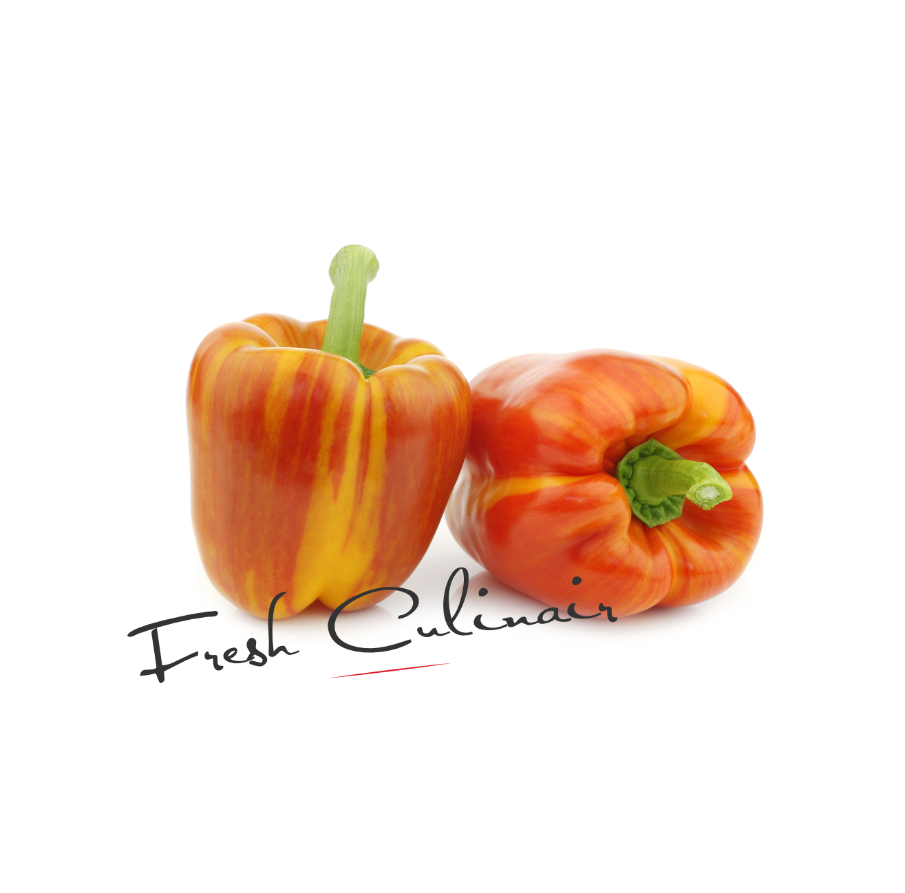 Enjoya bell peppers are well suited for both raw and cooking methods such as sautéing, baking, grilling, and roasting. The bright coloring and striping are best showcased raw, and the peppers can be chopped and added to green salads, sliced for vegetable plates with dips, or diced and mixed into bruschetta for a crunchy appetizer. Enjoya bell peppers can also be baked to showcase the striping and stuffed with cheeses, grains, and meat, rolled in sushi, baked into lasagna, stuffed into calzones, topped on pizza, chopped into tacos, roasted with meatballs, or skewered with pineapple and pork and grilled. In addition to cooked preparations, the peppers can be sliced in half, hollowed, flattened, and used as bread replacement for sandwiches. Striped Holland bell peppers pair well with quinoa, rice, risotto, lentils, kidney beans, zucchini, Romanesco, cauliflower, squash, mushrooms, potatoes, onions, garlic, cheeses such as goat, feta, mozzarella, and cheddar, almonds, bacon, prosciutto, shrimp, beef, fish, poultry, tomatoes, blackberries, olives, rosemary, oregano, thyme, and coriander.
